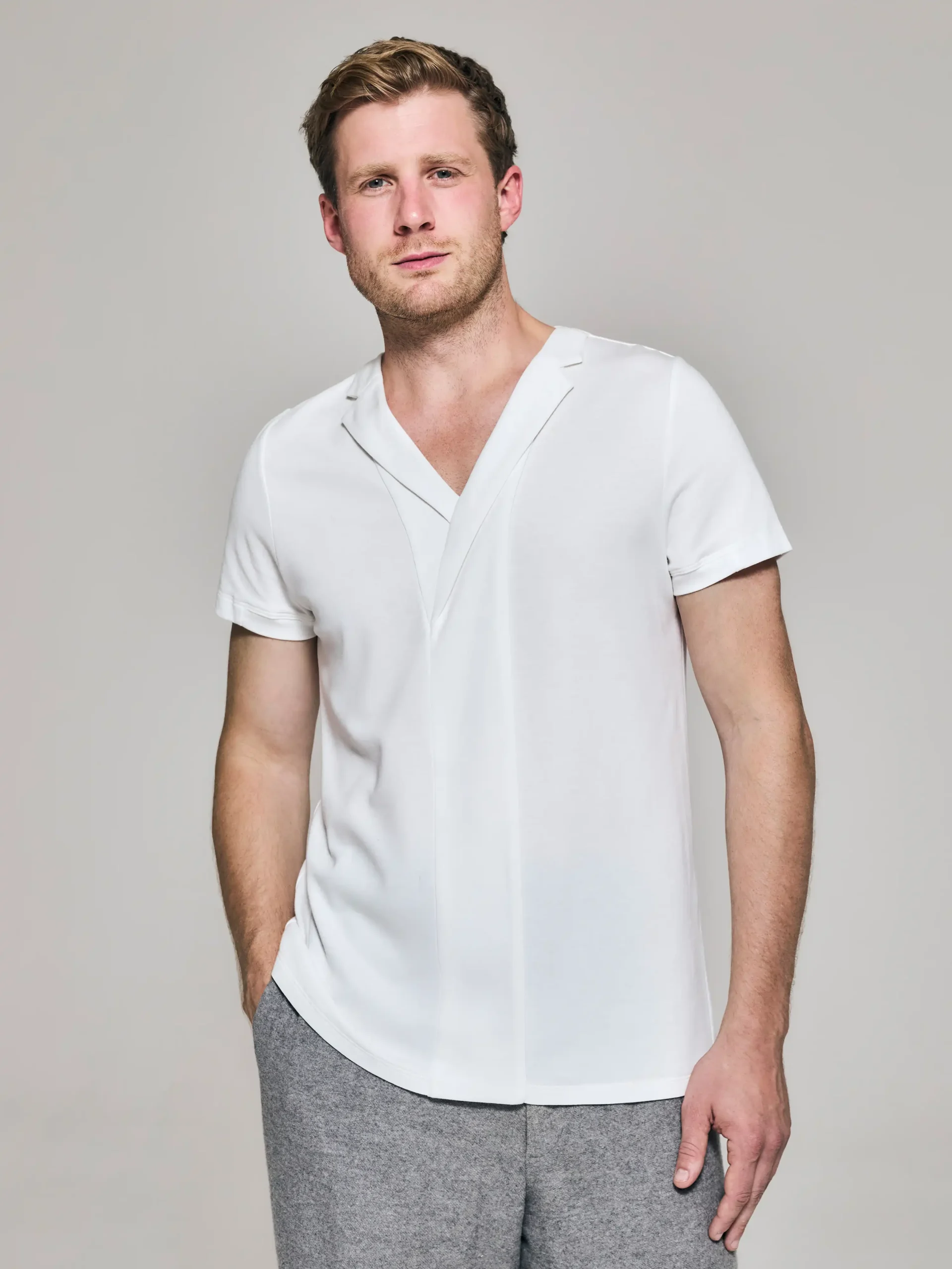• Front body panel with asymmetric lapels, introducing understated, gentlemanly nuance.